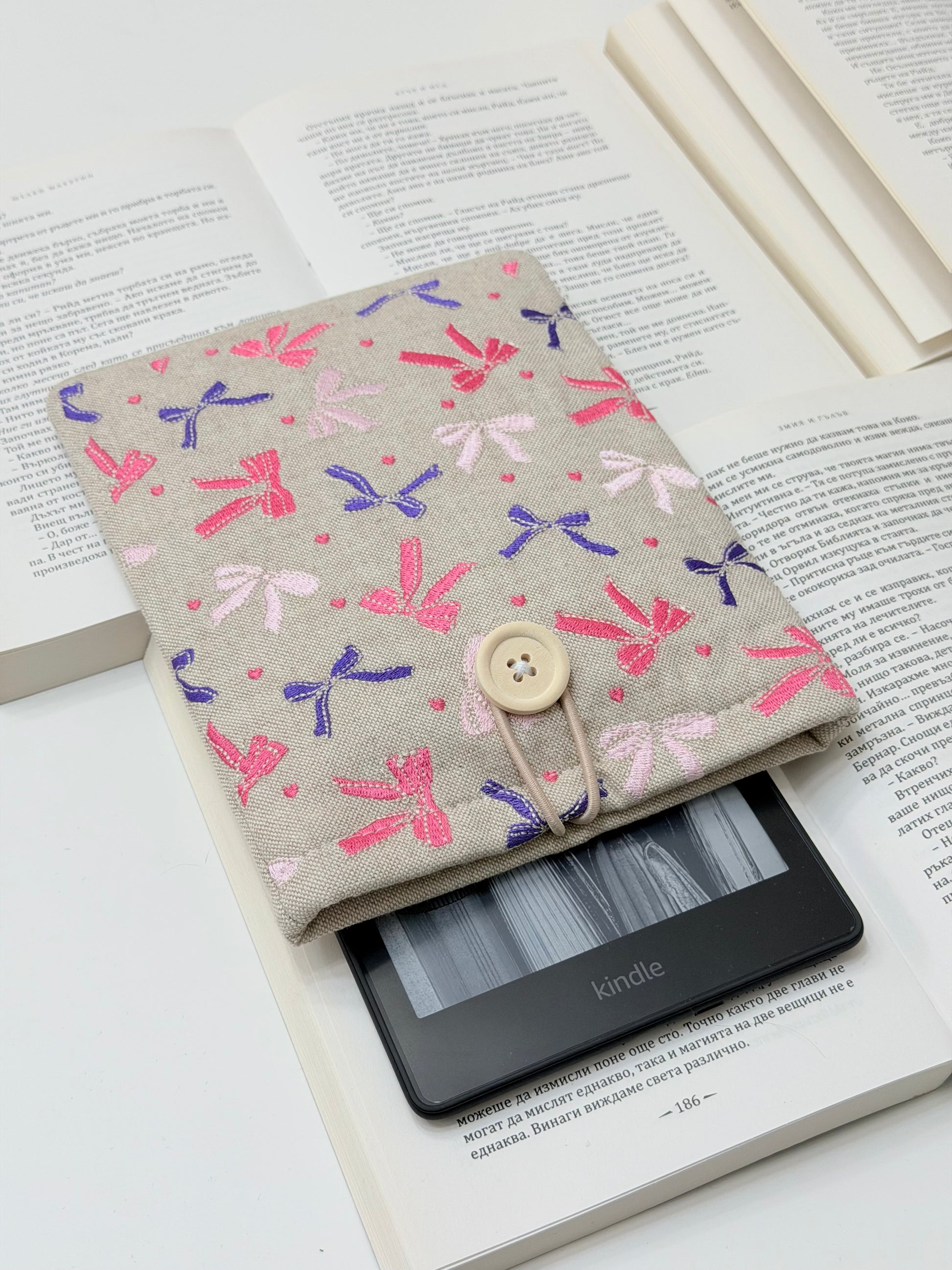 Keep your Kindle or e-reader safe in style with this embroidered ribbons padded sleeve. Handmade from soft linen, it combines elegant embroidery with gentle protection — the perfect gift for readers and digital book lovers.