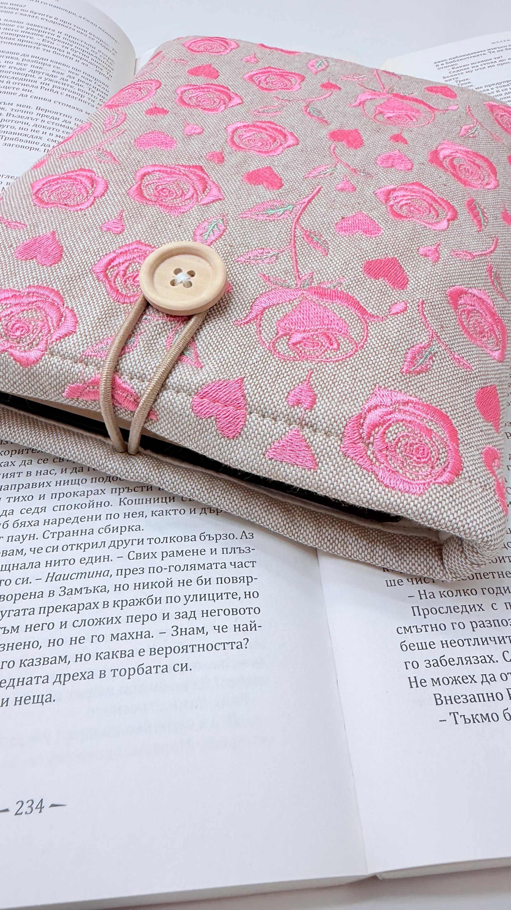 Pink Embroidery Roses Book Sleeve – Handmade Padded Linen Cover for Books and E-Readers