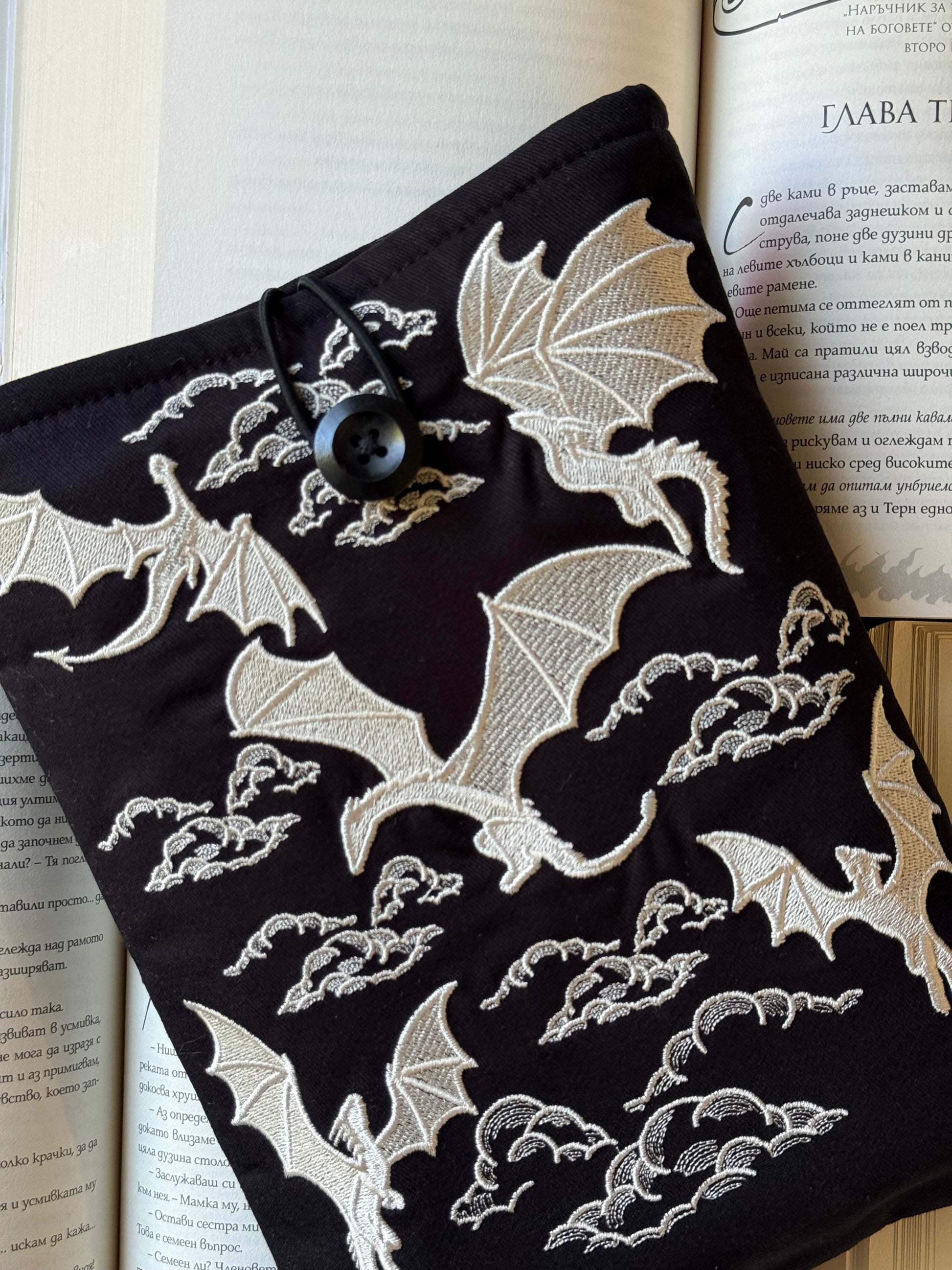 Unleash a touch of magic with this handmade padded book sleeve, featuring majestic dragons embroidered in shimmering gold thread. Designed to protect your books, Kindle, or e-reader from scratches, dust, and everyday wear, it blends durability with fantasy-inspired artistry.