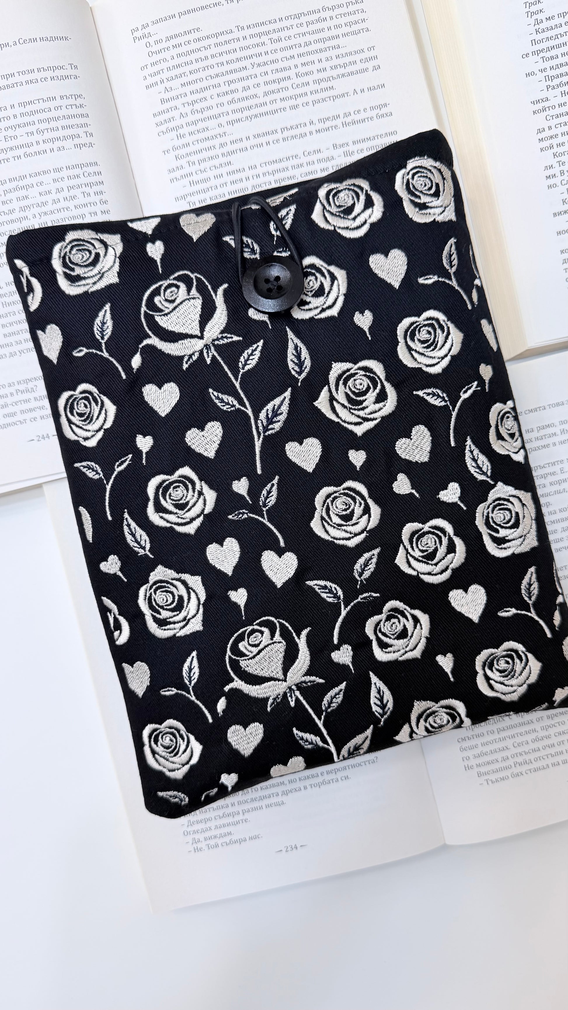 Protect your favorite reads in delicate beauty with our Baige Black Gothic Embroidery Roses Book Sleeve, handcrafted from soft linen and cotton fabrics. Each piece features elegant pink rose embroidery, symbolizing love, calm, and timeless charm.