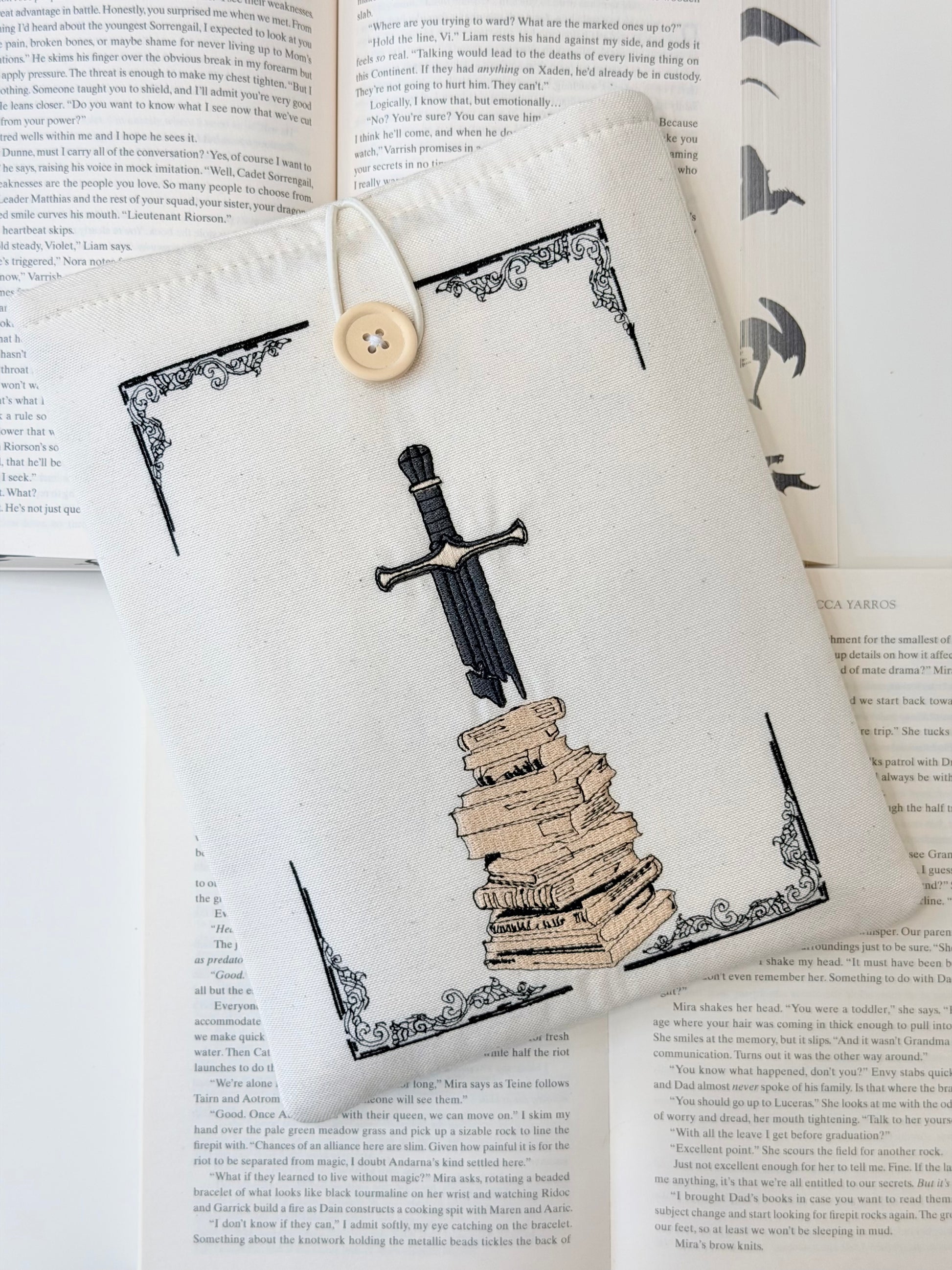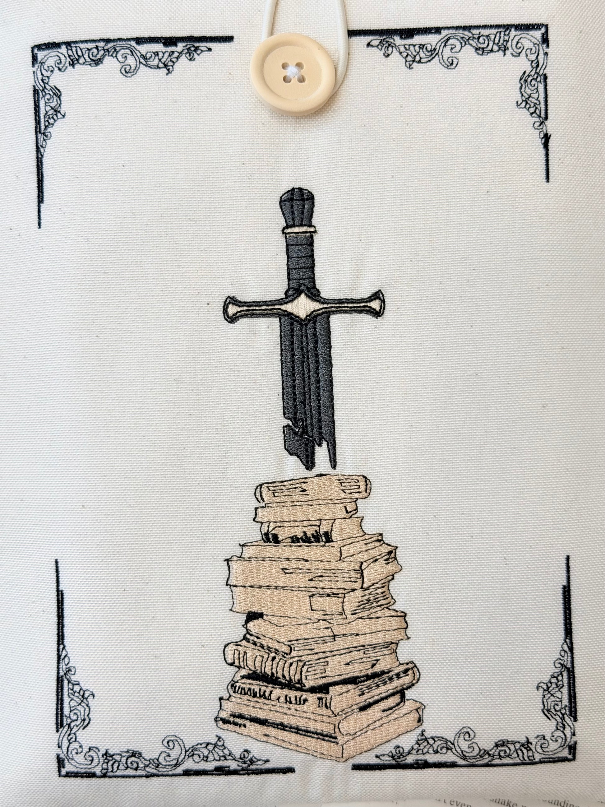 Handmade embroidered book sleeve with a sword and stacked books design. Padded fabric cover that protects novels, fantasy books, and special editions. Perfect for book lovers, dark academia fans, and fantasy readers.